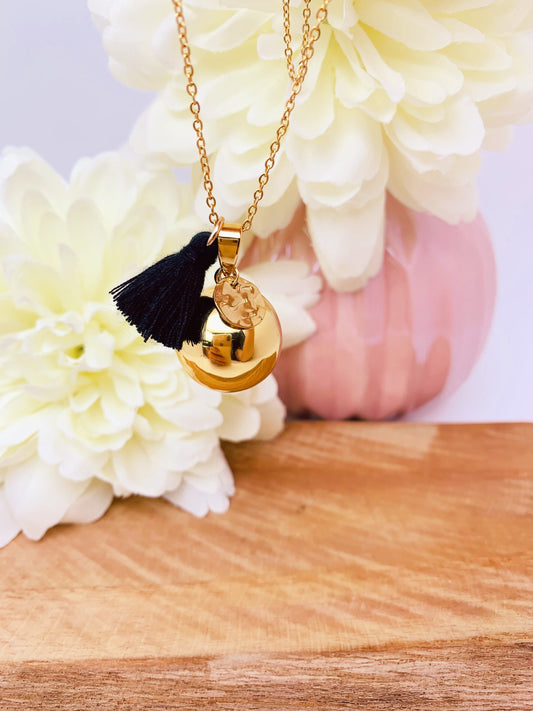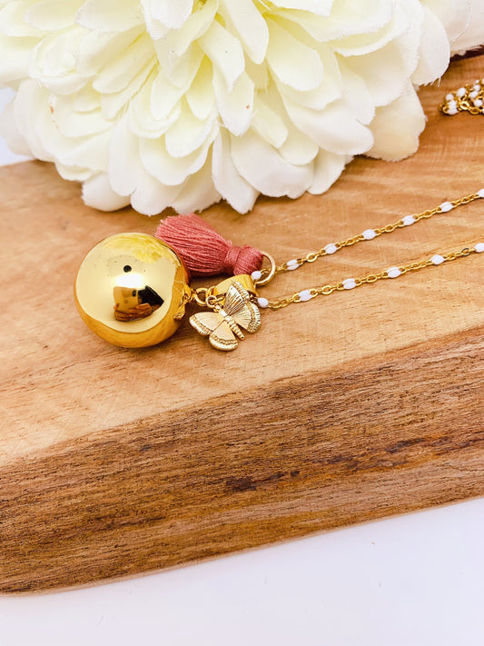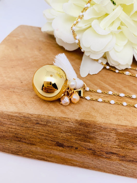 Le bola de grossesse est un bijou porté par les femmes enceintes depuis des générations dans plusieurs cultures. Suspendu sur un long cordon ou une chaîne, ce pendentif sphérique produit un tintement discret lorsqu’il bouge. Ce collier de grossesse se porte généralement à partir du 4ᵉ ou 5ᵉ mois de grossesse, lorsque le ventre commence à s’arrondir et que les mouvements deviennent plus perceptibles.