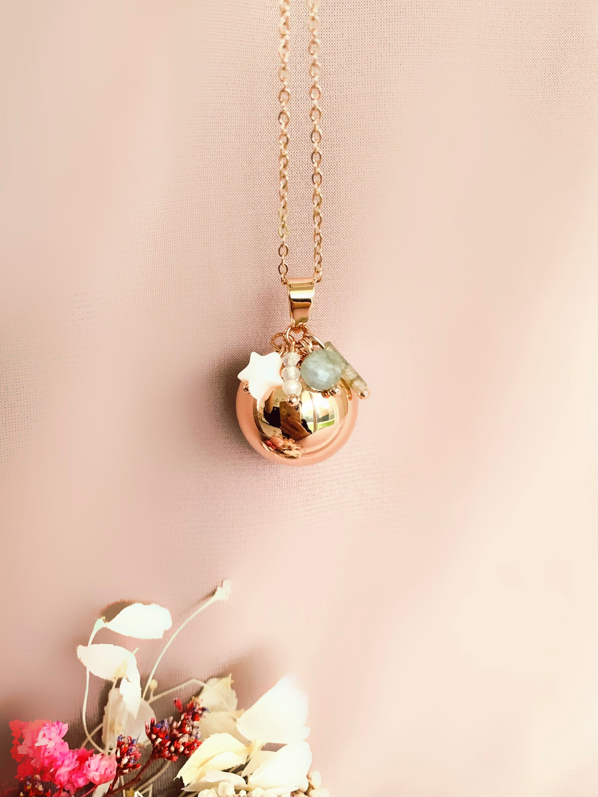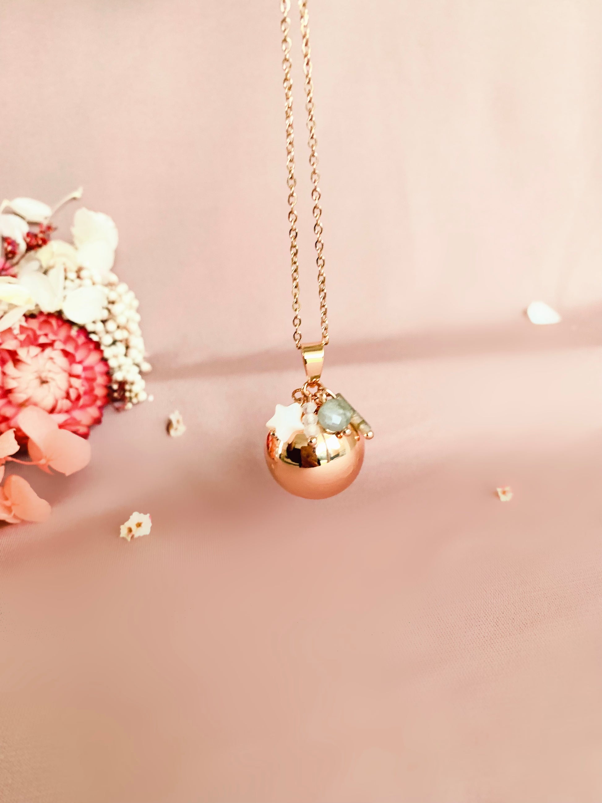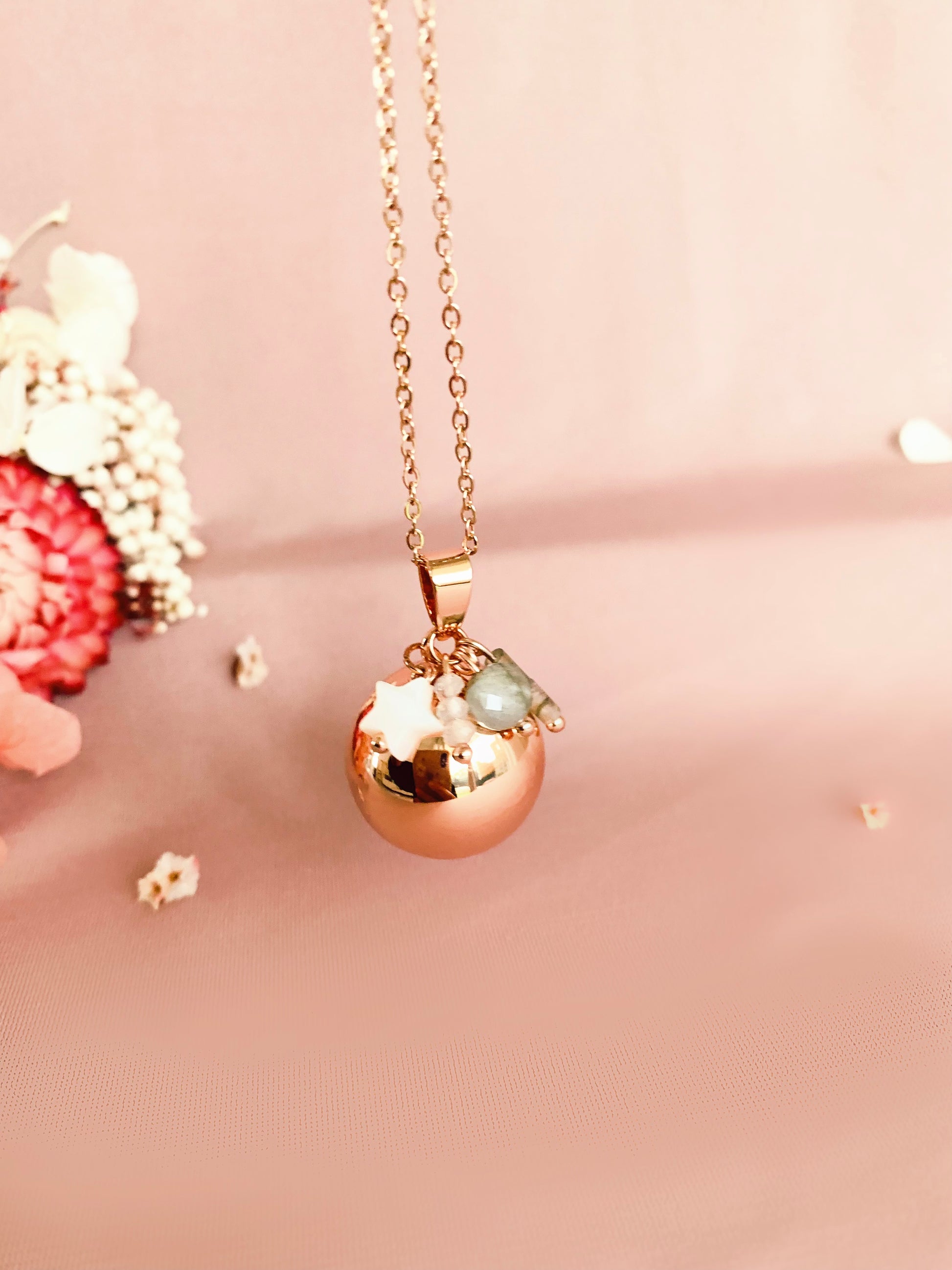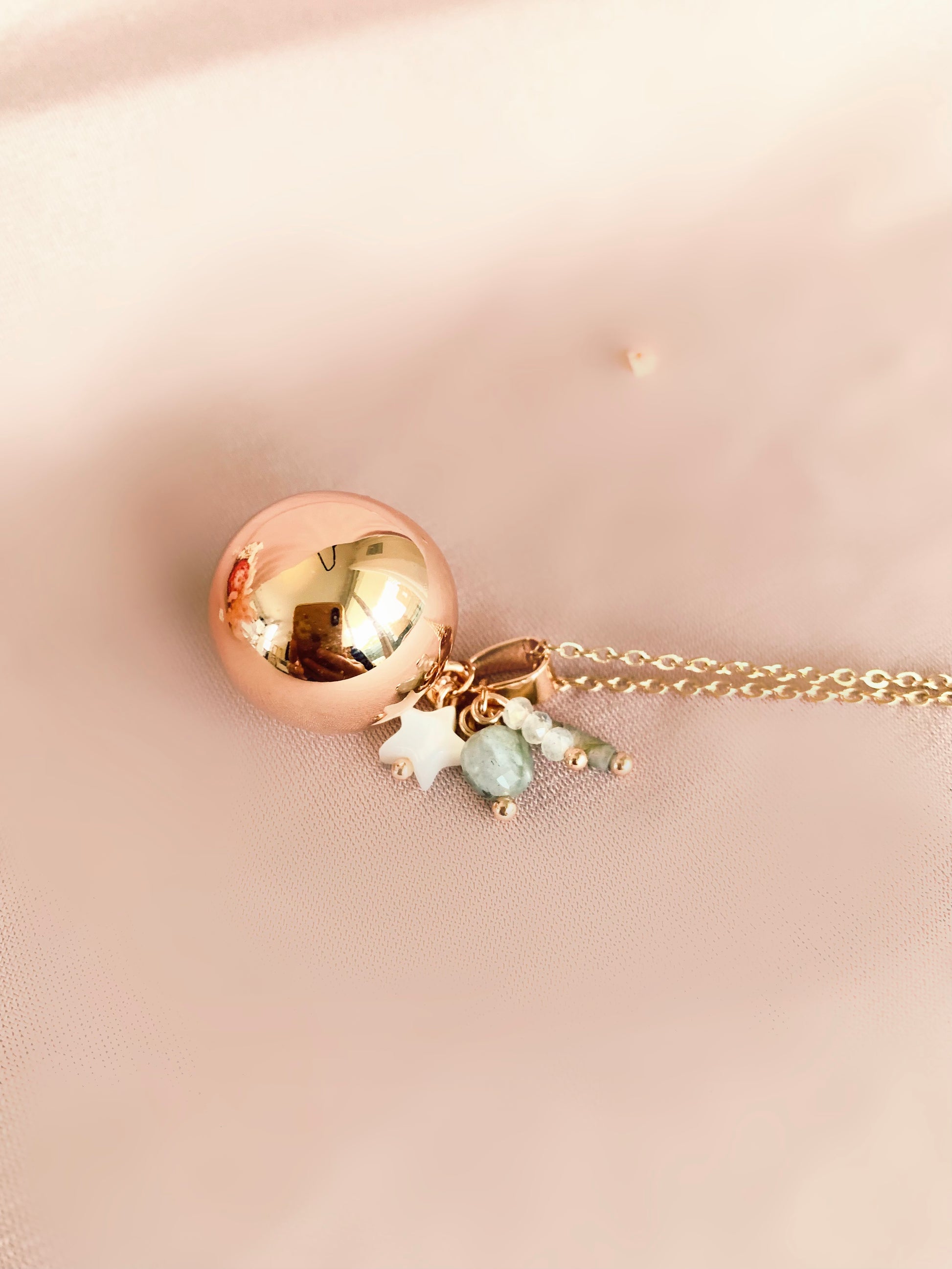 Bola de grossesse or rose stella et breloques en labradorite montée à la main une à une .